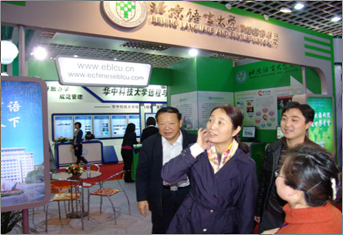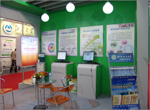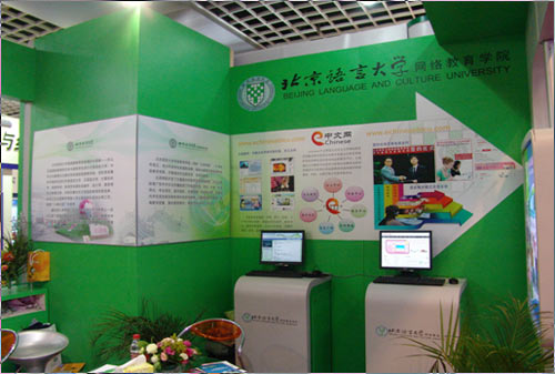 北語展區(qū)以銀灰色和草綠色為主色調(diào),設(shè)計風(fēng)格清新、時尚。對外,以液晶電視循環(huán)播放網(wǎng)院員工自己拍攝、制作的宣傳片;展區(qū)內(nèi),以展板和多媒體方式全方位展示了我院的發(fā)展歷程和建設(shè)成果。成果分為教學(xué)師資、課程資源、支持服務(wù)、虛擬校園、學(xué)習(xí)中心、漢語教學(xué)等幾大板塊。
