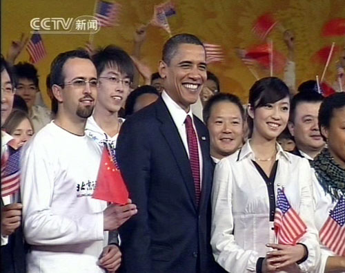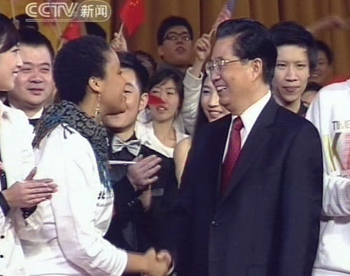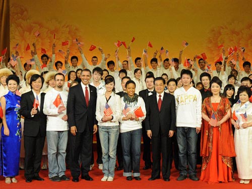 演出結(jié)束后,胡錦濤主席和奧巴馬總統(tǒng)來到中美青年學(xué)生和中國藝術(shù)家中間,對他們的精彩表演表示感謝并與演員合影留念。胡錦濤主席與我校美國留學(xué)生青葵親切握手,親切詢問她來華學(xué)習(xí)的情況。奧巴馬總統(tǒng)走到我校美國學(xué)生黃偉身旁,跟他進(jìn)行了簡短的交流。