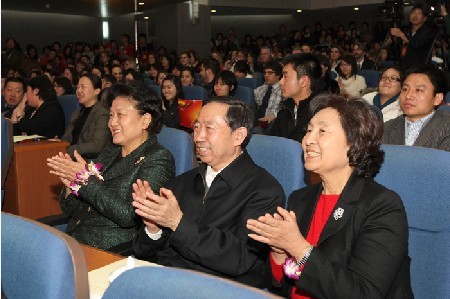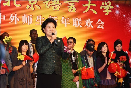 12月31日,在2010年元旦即將來臨之際,中共中央政治局委員、國務委員劉延東于來到北京語言大學,看望了在校的中外師生,與來自美國、英國、意大利、韓國、日本、保加利亞、喀麥隆、加納等50多個國家留學生一起迎接新年的到來,并代表黨中央國務院、中國政府向所有來華留學生和北語全體師生致以新年的祝福。教育部部長袁貴仁,教育部副部長李衛(wèi)紅,國務院研究室副主任江小涓,國家漢辦主任許琳等陪同蒞臨北京語言大學。