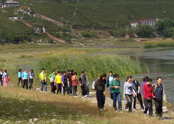 上午抵達基地后,大家稍事休整,熟悉拓展場地,游覽官廳水庫風光。臥牛山影視基地北靠臥牛山南臨官廳水庫,建筑和布局模擬的是抗戰(zhàn)時期的某村莊,那土坯房屋上的抗戰(zhàn)標語以及村邊的炮樓提醒著我們上個世紀中國人民英勇斗爭、前赴后繼的那段歷史。